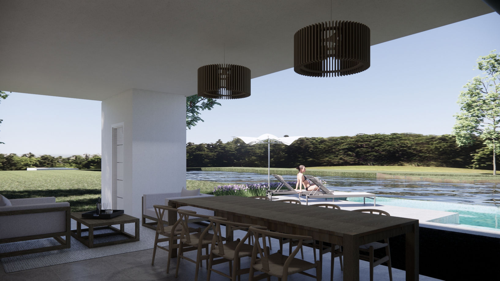 La Arquitectura no se impone al paisaje, sino que dialoga con él. Nacida de la forma irregular del lote y de la búsqueda de la mejor orientación solar, esta casa de dos niveles se despliega en un gesto envolvente, un verdadero abrazo al parque y a la laguna. Su diseño minimalista mediterráneo evoca una serenidad atemporal, donde la luz es el principal material de construcción.